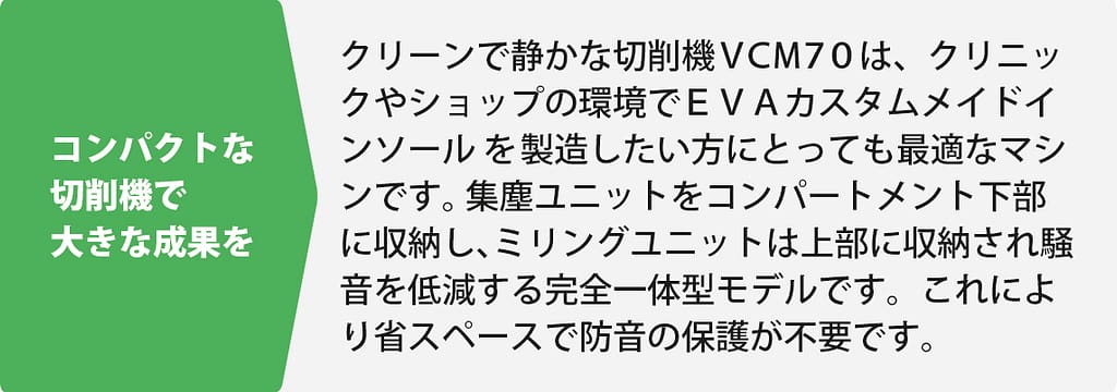 クリーンで静かな生産 VCM70 は、クリニックやショップ環境で EVA カスタムメイドインソールを製造したい方にとって最適なオプションです。集塵ユニットを下に収納し、ミリングユニットをコンパートメントに収納して騒音を低減する完全一体型モデルで、防音の保護が不要です。